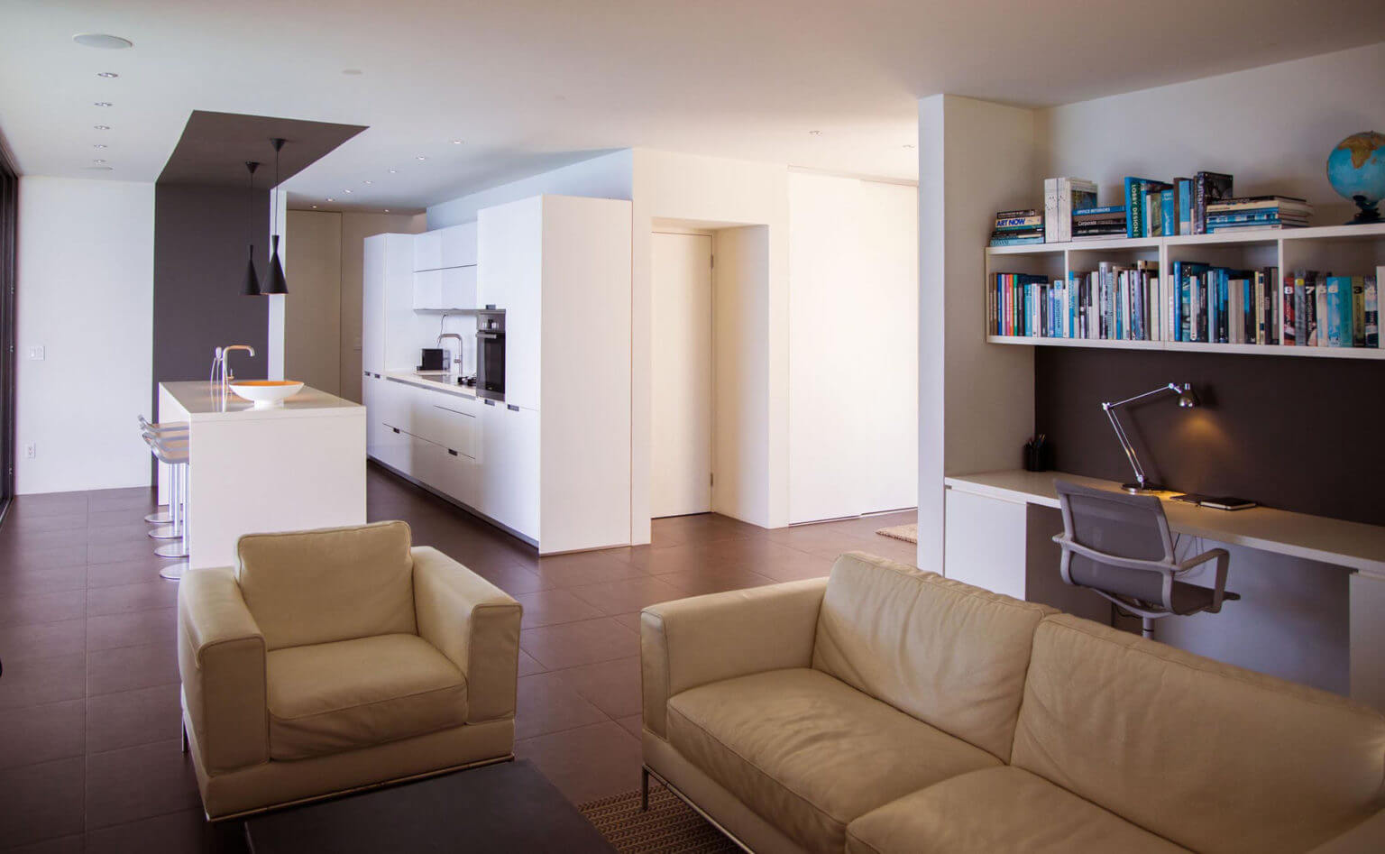 • Open kitchen area with kitchen island bar and stools