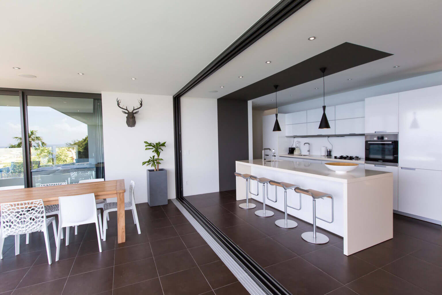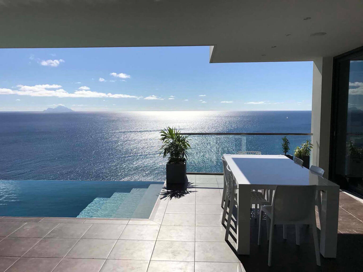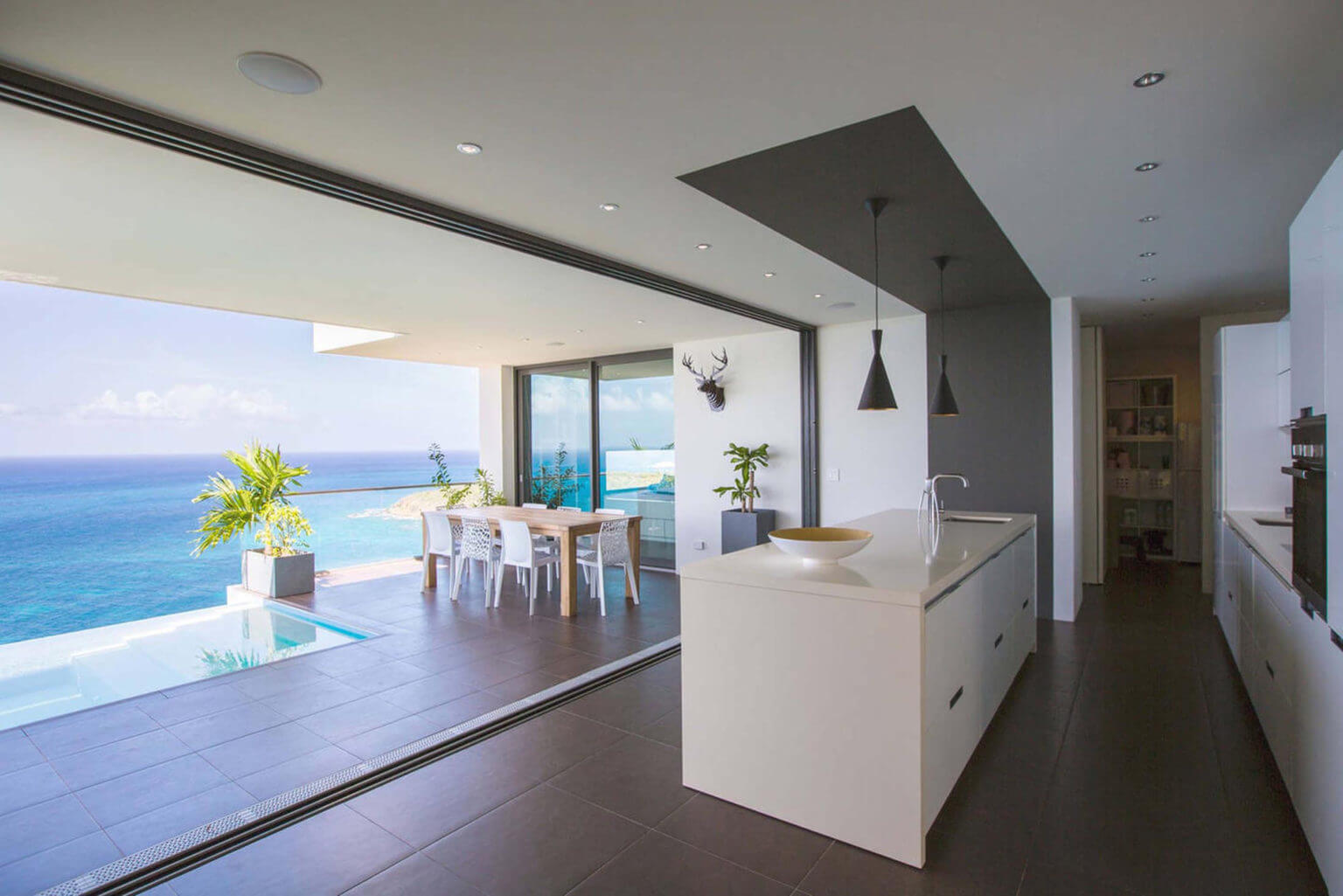 The living and open kitchen area are on the main level next to the master suite. They open onto an extended outside pool area that boasts breathtaking views of the islands Saba, St. Eustatius and St. Kitts. The living room and open air kitchen provides a spectacular indoor-outdoor living experience which open onto the infinity pool deck that boasts breathtaking unobstructed views of the surrounding islands and the ever-changing ocean view.